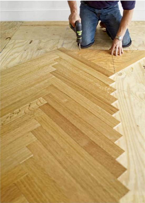 Use the router to cut a groove around the perimeter so that you can add an apron of long flooring strips to frame the herringbone.